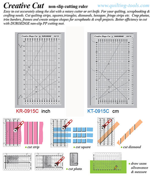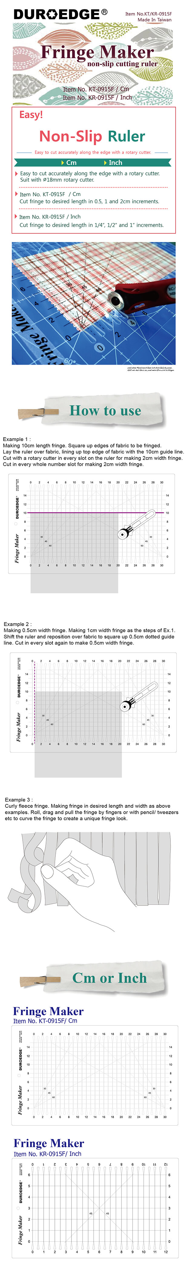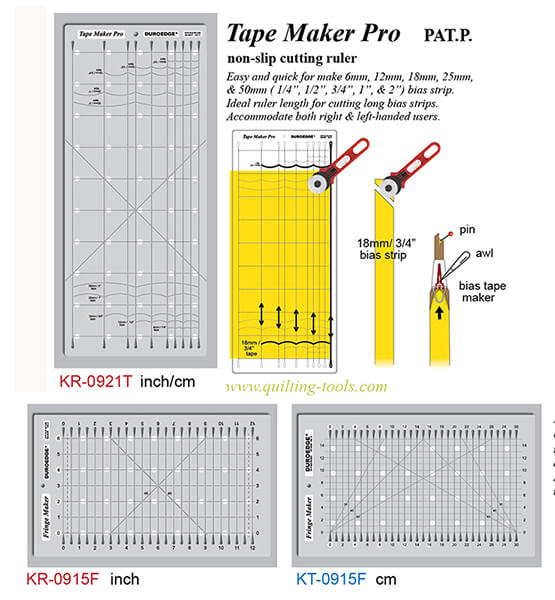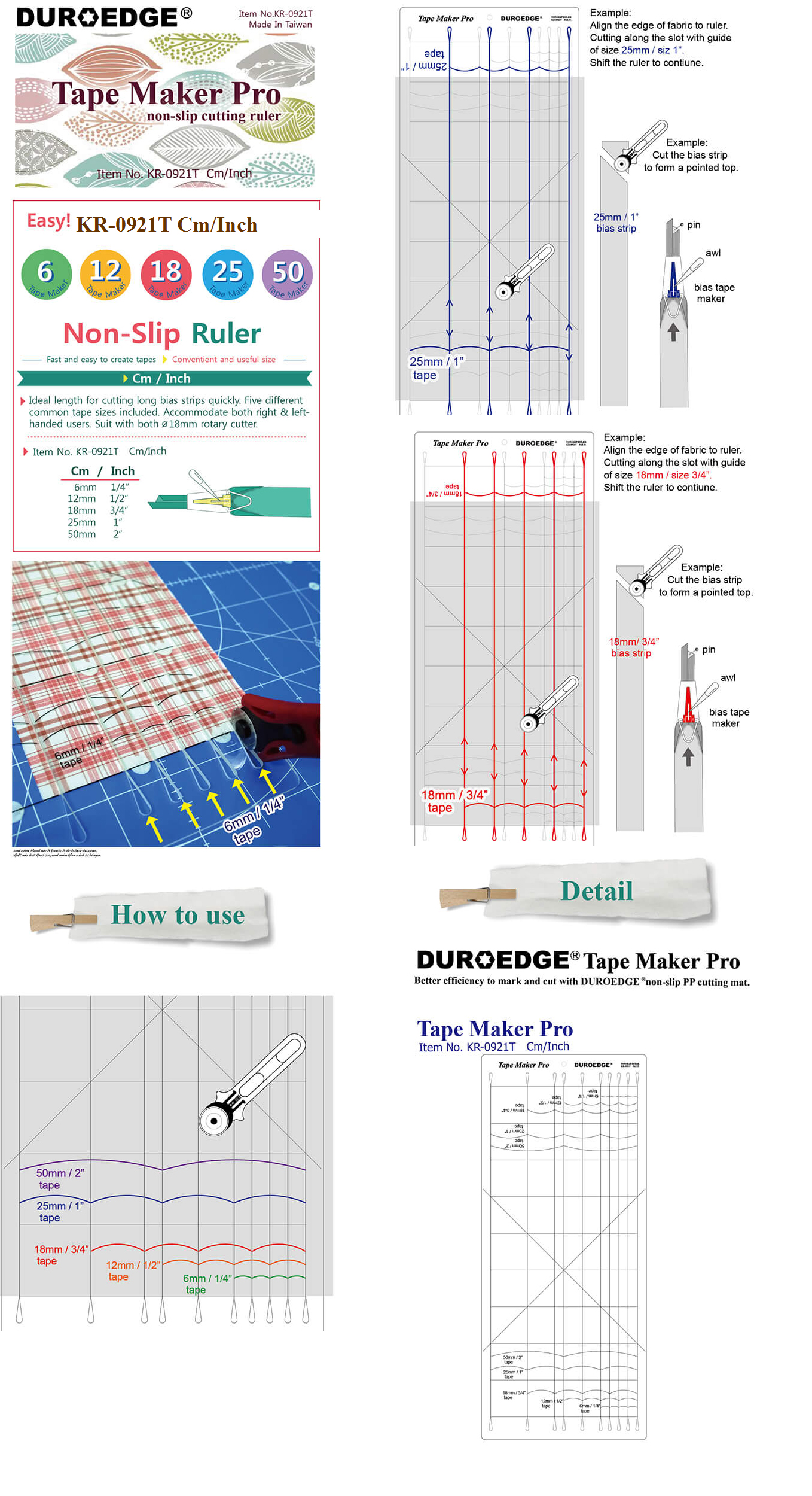 Tape Maker Pro PAT.P. non-slip cutting ruler Easy and quick for make 6mm, 12mm, 18mm, 25mm, & 50mm ( 1/4", 1/2", 3/4", 1", & 2”) bias strip. Ideal ruler length for cutting long bias strips. Accommodate both right & left-handed users.